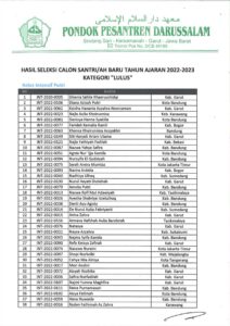 PENGUMUMAN HASIL SELEKSI CALON SANTRI BARU TA. 2022-2023 M